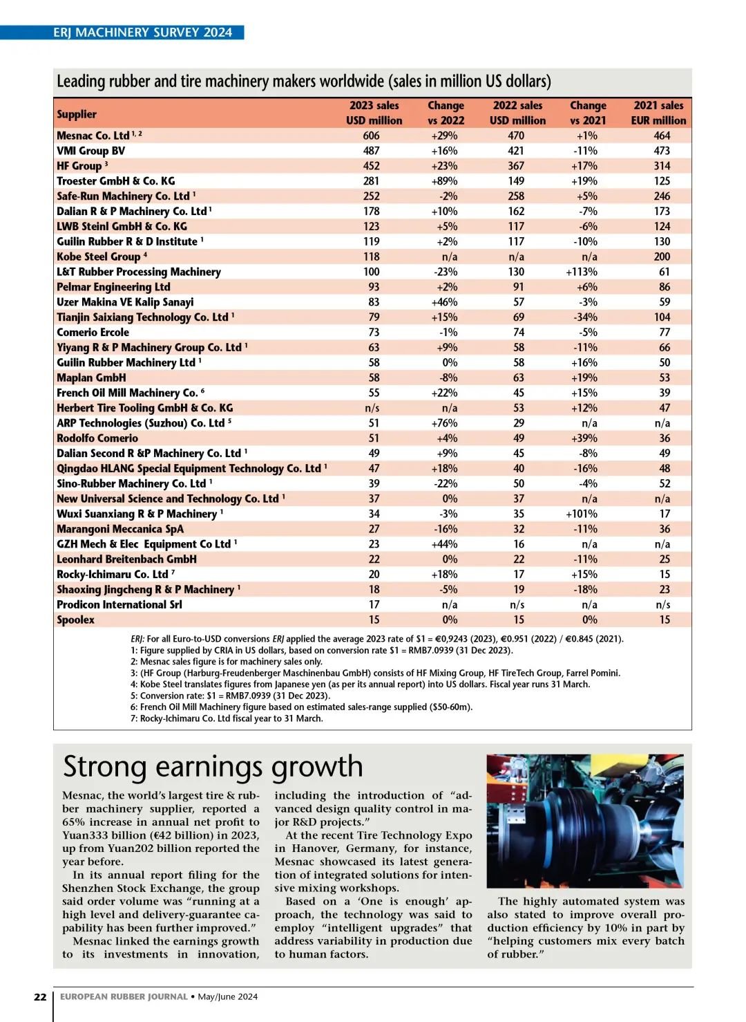 在最新出版的欧洲橡胶杂志(European Rubber Journal) 5/6月刊,公布了2023年全球橡胶机械行业企业的销售收入排名,6686体育(MESNAC)蝉联榜首。