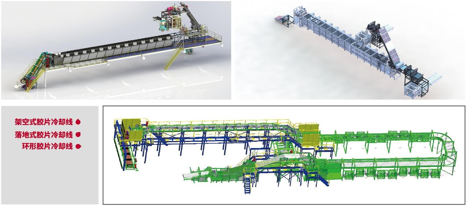 胶片冷却线是密炼机的配套设备,在胶片冷却叠片时,与开炼机或双螺杆挤出机组成现代化炼胶下辅机系统,对胶片实现接取、打标、纵裁、浸涂隔离剂、风干、叠片、称重等,可广泛应用于轮胎、制品行业。