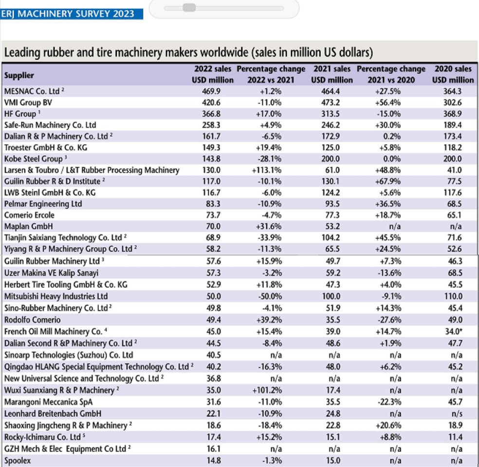 在最新出版的欧洲橡胶杂志(European Rubber Journal) 5/6月刊,公布了2022年全球橡胶机械行业企业的销售收入排名,6686体育(MESNAC)位居第一。